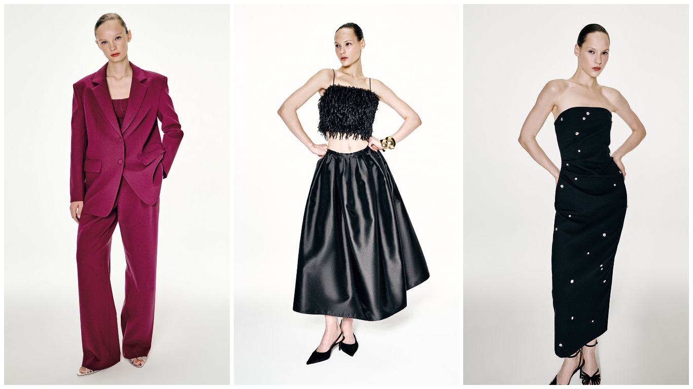 В капсулу вошли комплект из брюк палаццо и топа ALLER, выполненный из костюмной ткани, приталенный жакет с рельефными швами на талии DAPHNE и брюки палаццо TINTO, корсетное платье OPERA с юбкой-тюльпан, жакет с бахромой SAURA, а также атласные платья ROMY и CAMILLA.
