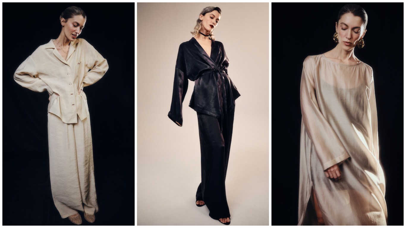 В капсуле акцент на полупрозрачные и струящиеся ткани. Например, пижамный костюм из шелковистой ткани, костюм кимоно с брюками в двух оттенках — песочно-бежевый и черничный. Платья из тонких тканей — комбинация в черном цвете, которая идеально подойдет для романтических вечеров, праздников и повседневных домашних дел, а платье футляр в длине макси, благодаря своей прозрачной ткани можно сочетать как с бандо и шортами, так и надевать поверх комбинации.