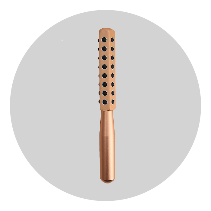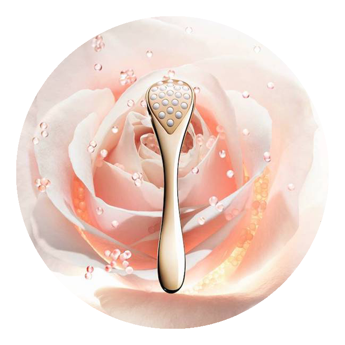 Массирующий аппликатор состоит из 21 керамической жемчужины, имеет охлаждающий эффект золотого металла и форму лепестка розы. Он освежает кожу и делает ее более восприимчивой к наносимому уходу.