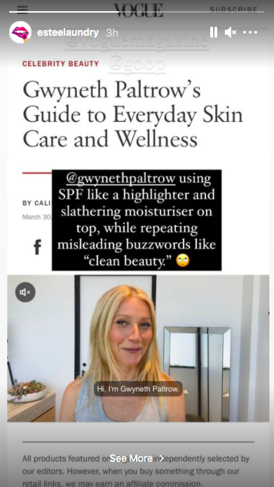 Претензия состояла в том, что Гвинет неверно наносит SPF крем. «Прямо как хайлайтер!» – написали в анонимном бьюти-сообществе Estée Laundry. К истории подключились именитые косметологи. Нью-йоркский специалист по работе с акне Софи Пэвит объяснила: «Ради Бога, не наносите SPF как хайлайтер. SPF в достаточном количестве должен использовать каждый, если вы не хотите начать преждевременно стареть или заболеть раком кожи». А звездный косметолог Кэролин Хайронс, автор Sunday Times и Instagram-блогер с 600 тысячами подписчиков, сделала серию постов и историй на эту тему, осудив и Гвинет, и Vogue, за то, что последние дают площадку таким квалифицированным «специалистам».