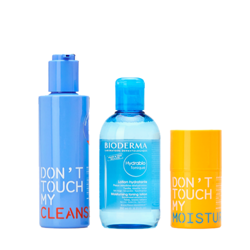 В набор для обезвоженной кожи входят: мягкий гель для умывания DON’T TOUCH MY CLEANSER, лосьон BIODERMA HYDRABIO LOTION и крем DON’T TOUCH MY MOISTURIZER LIGHT.