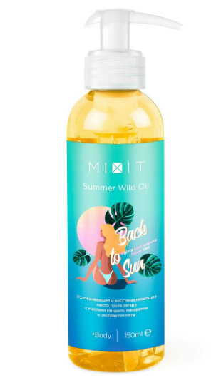 Если любите масла для тела, присмотритесь к Back to sun, Mixit. В его составе — микс из разных масел — кокоса, миндаля, макадамии, лаванды, пачули и мяты, сочетается с растительными экстрактами мяты перечной, розмарина и зеленого чая. Средство смягчает и питает кожу, защищает от преждевременного старения, повышает эластичность. А благодаря натуральному аромату, нанесение масла превращается в домашний SPA-ритуал.