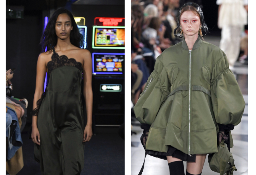 Эпоха гранжа 90-х определяется сочетанием практичности и женственности: высокие ботинки в паре с шелковыми комбинациями, украшенными кружевом, или топы, обнажающие живот, вместе с брюками-карго. Simone Rocha сделали более грубыми свои традиционные воздушные платья, добавив детали летной куртки и заменив обычную отделку из бледного кружева износостойким зеленым цветом хаки.