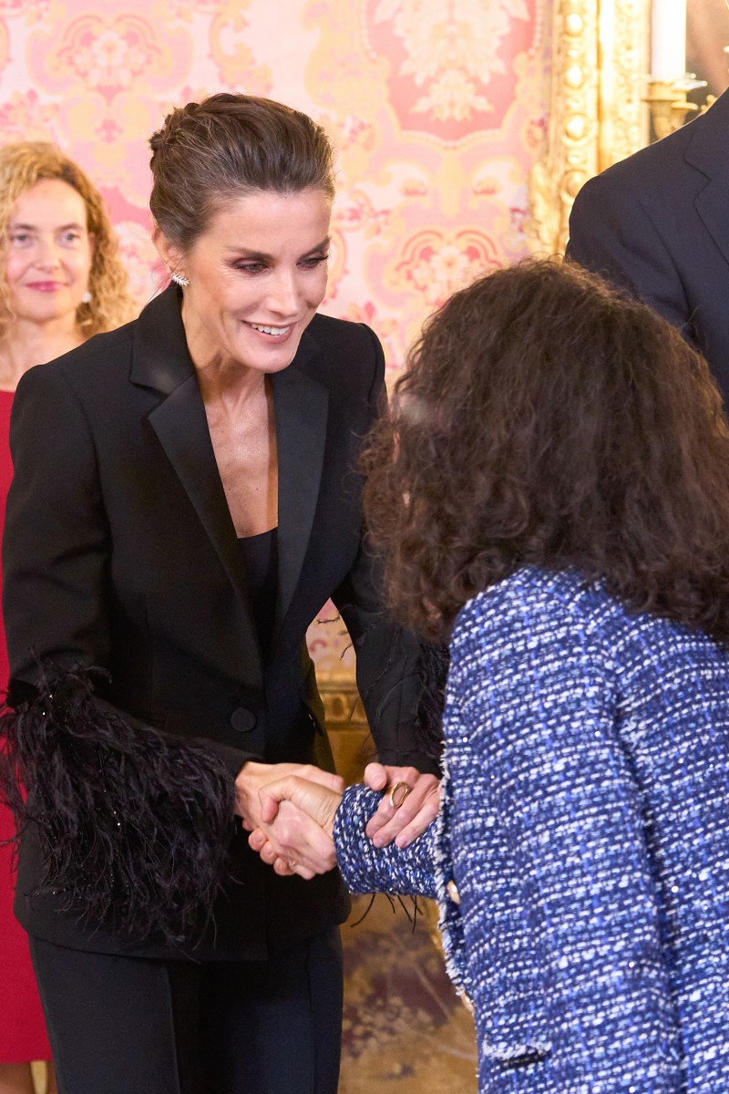 Недавно Летисия появилась на официальном приеме в черном жакете Pertegaz с перьями, воссоздав во дворце Мадрида рождественское настроение. А чтобы стиль выглядел максимально сдержанно, как полагается на подобных мероприятиях, она собрала волосы в гладкий пучок и сделала нюдовый макияж. Однако еще одну деталь в ее луке невозможно оставить без внимания — серьги Chanel из белого золота и с бриллиантами, сделанных тоже в виде перьев.